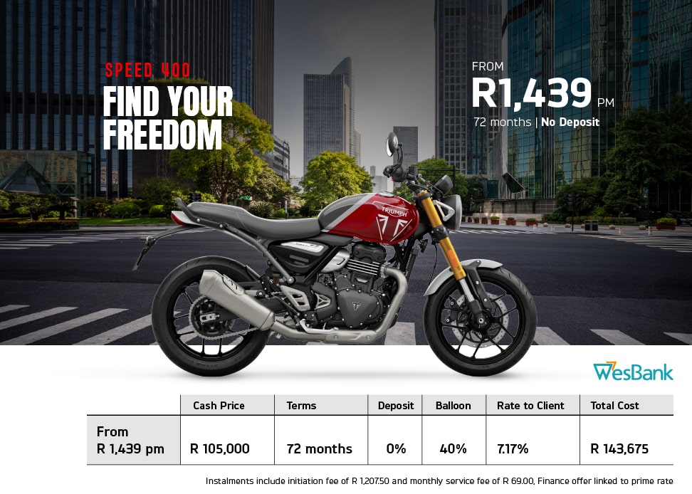 For today’s originals, now more attainable than ever. Whether it’s the daily commute or a weekend escape, the Speed 400 delivers character, performance, and unmistakable Triumph quality. For a limited time, enjoy an interest rate of 7.17%, that’s 3.08% below prime, when purchasing a brand-new Speed 400. Starting from just R 1,439 per month over 72 months. Price shown for standard model. Optional paint variants available at an extra cost.