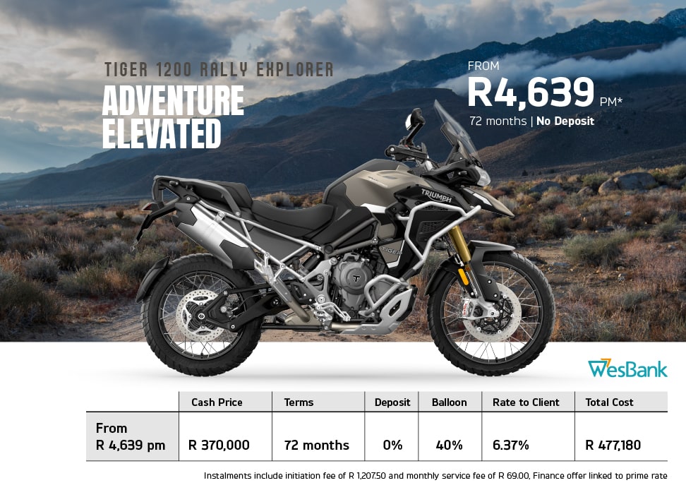 The Tiger 1200 Rally Explorer redefines endurance. From untamed trails to endless highways, it delivers confidence, comfort, and capability in every ride. For a limited time, enjoy an interest rate of 6.37%, that’s 3.88% below prime, when purchasing a brand-new Tiger 1200 Rally Explorer. Starting from just R 4,639 per month over 72 months. Price shown for standard model. Optional paint variants available at an extra cost.
